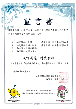 全国保険協会福島支部(協会けんぽ)の推進する「健康事業所宣言」を行い、認定をいただきました。